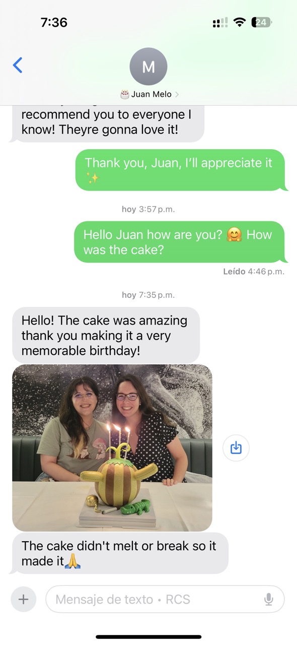 Además de estar delicioso, el pastel también era muy bonito y se entregó a tiempo. ¡La recomendaría 100% para cualquier pastel personalizado que cualquiera quisiera!